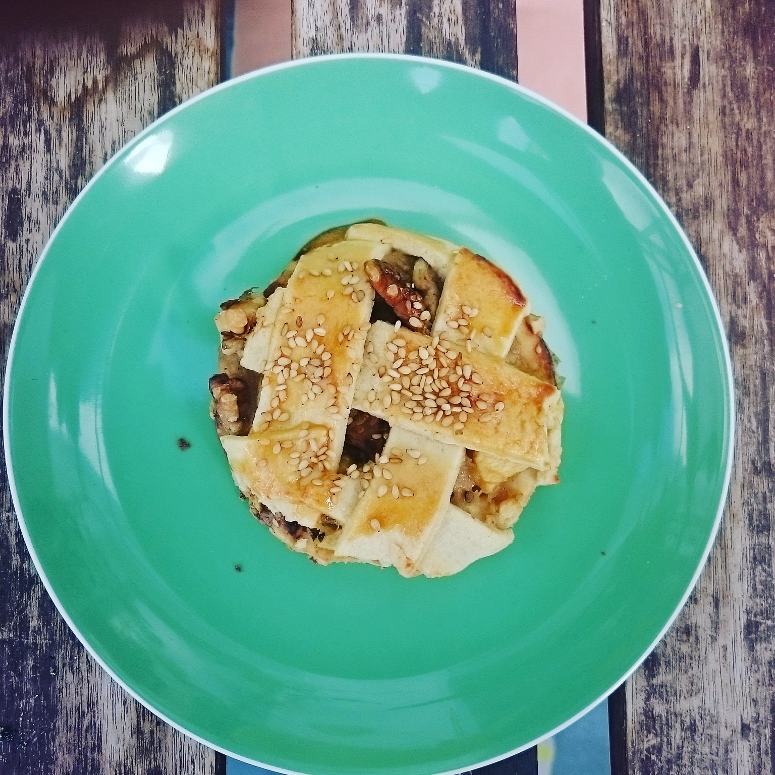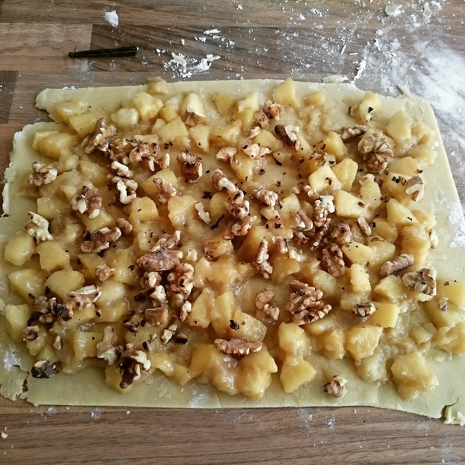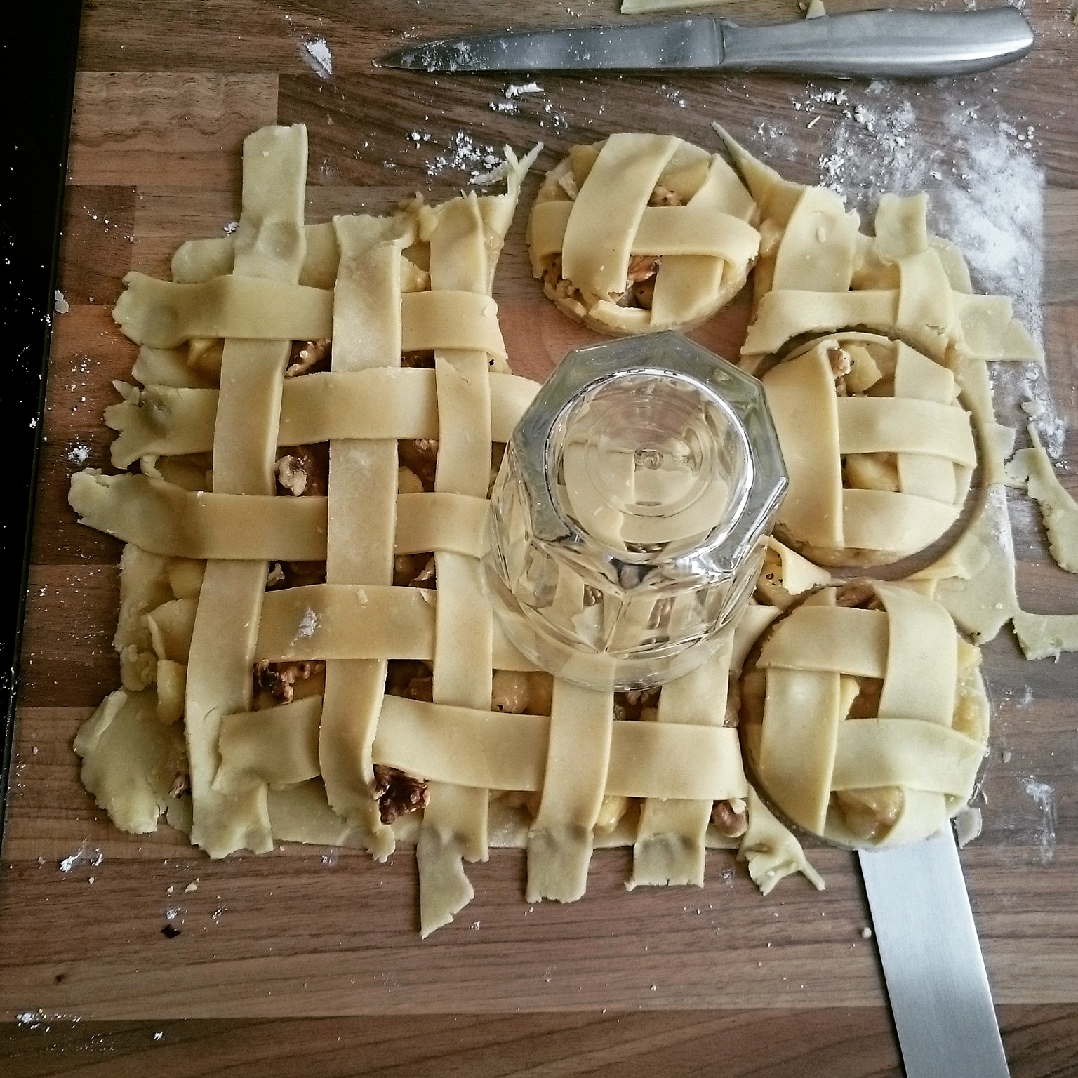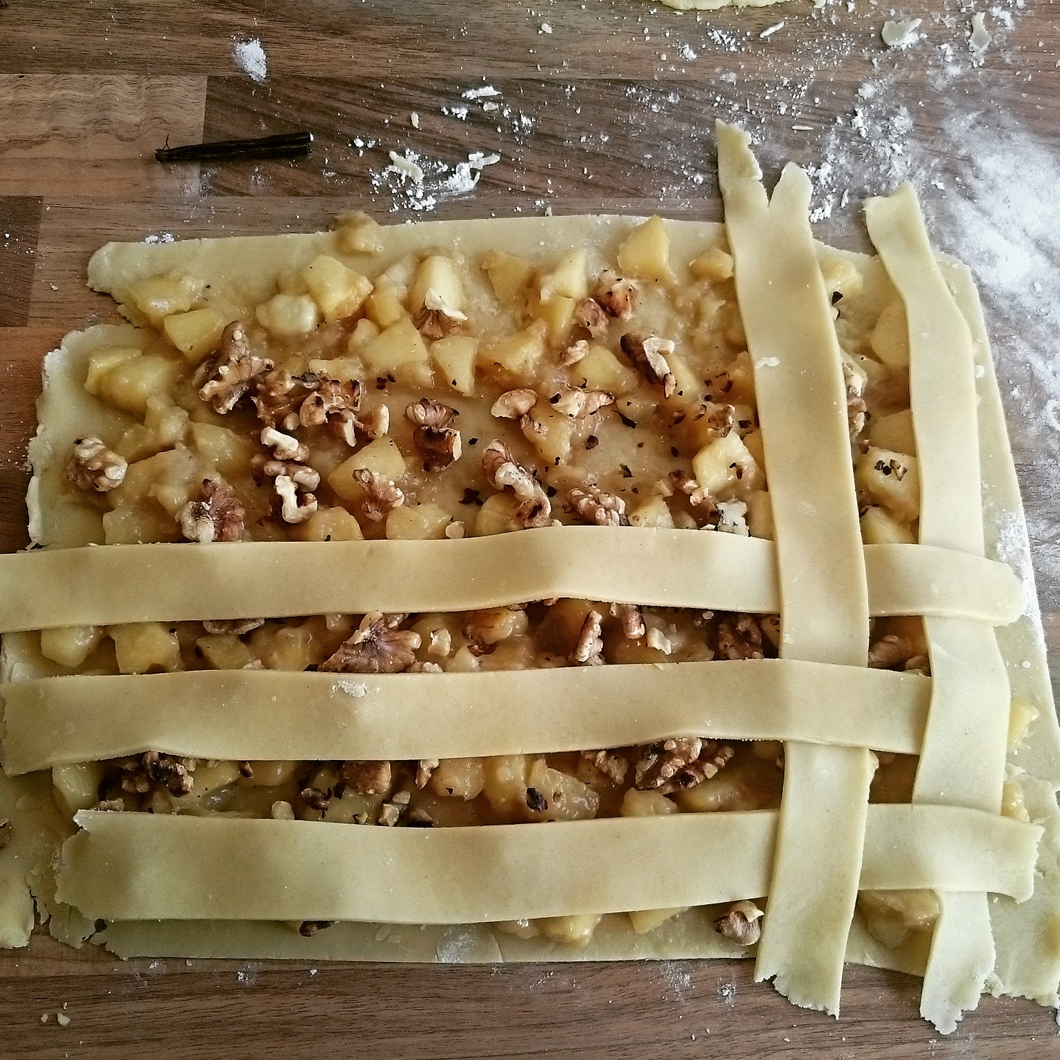 Den Teig halbieren und jeweils ausrollen, auf die 1. Hälfte die Äpfel mit den gerösteten Walnüssen verteilen. Die 2. Hälfte in gleichgroße Streifen schneiden.