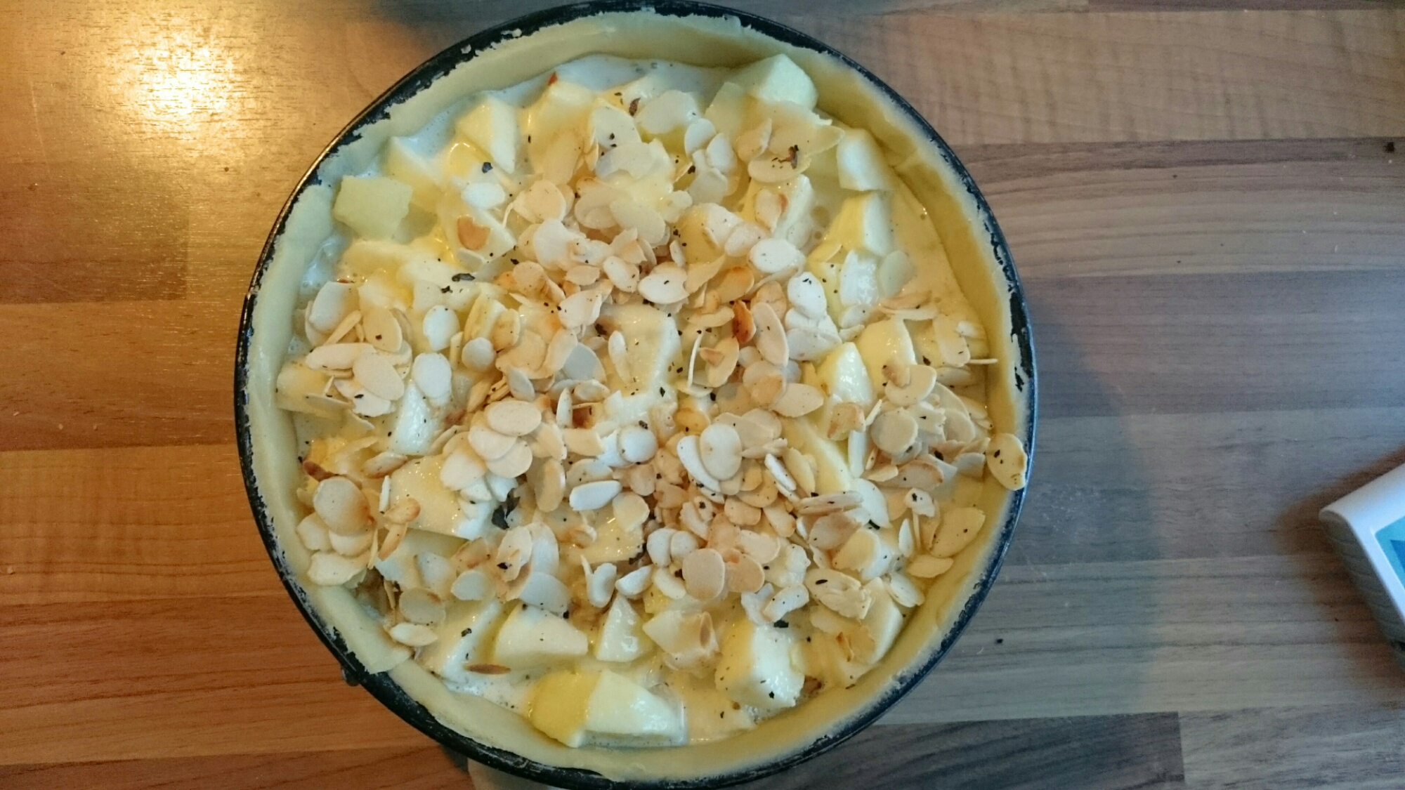Während der Teig im Kühlschrank fest wird, die Äpfel schälen, entkernen und würfeln. Dann die Sahne, Vanille, Apfelmus, die Eier, Zimt und Zucker miteinander verquirlen und die Nüsse kurz ohne Öl in der Pfanne anrösten und zu den Äpfeln geben. Mandelblättchen ebenfalls kurz anrösten und beiseite stellen.